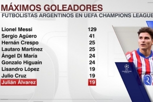 阿根廷球員歐冠射手榜:梅西129球居首,阿爾瓦雷斯19球并列第七