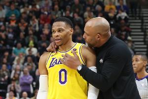 今日,湖人記者Harrison Faigen在個(gè)人社交媒體上發(fā)布了一張圖(如下),并配文:“只有一個(gè)人能執(zhí)教拉文+莫蘭特+威少的后場?!?/p>