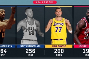 在賽季的前五場比賽中,東契奇合計得到200分,歷史第三高,僅次于張伯倫,詳情如下: