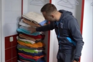 視頻中最引人注目的部分包括理療室沒有燈光,從高處取下的一堆破損且連在一起的衣架,以及每條毛巾顏色和款式各不相同。