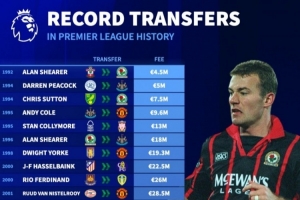 1992年 阿蘭-希勒:450萬(wàn)歐(南安普頓→布萊克本)