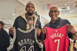 賽前,杜蘭特和馬刺名宿“冰人”喬治-格文交換球衣。