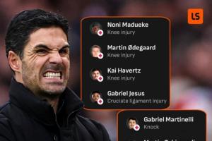 目前,哈弗茨、馬杜埃凱、馬丁內(nèi)利、約克雷斯仍處于傷病未愈的狀態(tài),熱蘇斯剛剛回歸訓(xùn)練,槍手一線隊(duì)前鋒僅特羅薩德和薩卡兩人健康能夠上場(chǎng),中場(chǎng)梅里諾還客串出任首發(fā)中鋒。