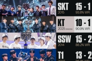 值得注意的是,KT目前10勝1負(fù),若決賽橫掃T1,KT勝率有望躋身歷史第二。