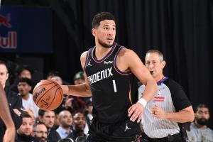 本場比賽布克出戰(zhàn)37分鐘34秒,19投8中,三分3中0,罰球5中5砍下21分10籃板9助攻,出現5次失誤,正負值+7。