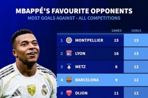 姆巴佩生涯各項(xiàng)賽事進(jìn)球最多球隊(duì):