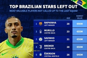 未入選本期巴西隊(duì)名單球員身價(jià)榜(包括因傷缺席):