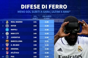 體育資訊11月15日訊 德國轉(zhuǎn)會市場統(tǒng)計了2020-2021賽季以來球隊在五大聯(lián)賽中的場均失球,并列出場均失球最少榜單,皇馬0.86球居首,國米、那不勒斯前三。