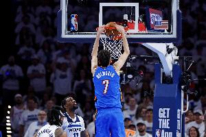 雷霆內線霍姆格倫上半場表現(xiàn)活躍,不僅有突破單手劈扣的精彩表現(xiàn),籃板拼搶和防守上也充分發(fā)揮他的身高優(yōu)勢和靈活性。