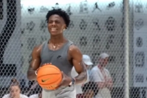 跟CBA比還是差點(diǎn)楊瀚森搶板卡位被肘擊喉嚨 笑了笑表示沒事