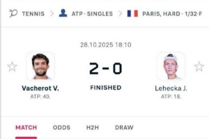 體育資訊10月28日訊 ATP1000巴黎大師賽首輪,持外卡出戰(zhàn)的瓦舍羅6-1/6-3橫掃14號種子萊赫卡,晉級第二輪。