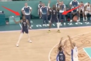 談到巴黎奧運(yùn)會決賽“金色匕首”驚世一投,庫里笑道:“我到現(xiàn)在想到那張照片就想笑,你(指詹姆斯)和KD在那兒高舉著雙手(要球)。”