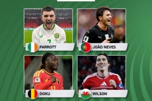 體育資訊11月19日訊 歐洲世預賽最后一輪比賽戰(zhàn)罷,歐足聯(lián)官方公布了本輪最佳球員候選名單。