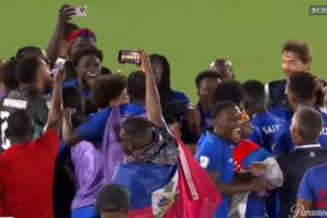 在比賽結(jié)束后,海地球員圍在一起等待哥斯達(dá)黎加vs洪都拉斯的結(jié)果。在哥斯達(dá)黎加vs洪都拉斯比賽結(jié)束后,海地球員瘋狂慶祝。