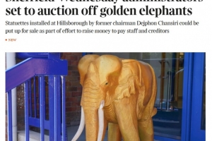 體育資訊10月28日訊 據(jù)《泰晤士報(bào)》報(bào)道,進(jìn)入托管狀態(tài)的謝周三俱樂部正采取多種措施籌集資金,托管人準(zhǔn)備拍賣掉前主席錢西里安放在希爾斯堡球場(chǎng)的兩尊標(biāo)志性金象雕像。這些雕像因擔(dān)心被球迷破壞或盜竊已被移至室內(nèi)。