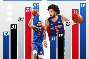 體育資訊11月21日訊 NBA官方曬出了康寧漢姆五個(gè)賽季以來的得分、助攻數(shù)據(jù)的提升表現(xiàn)。