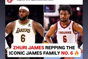 詹姆斯轉發(fā)了媒體曬出的他和三個子女都身穿6號球衣的照片。詹姆斯的兩個兒子布朗尼和布萊斯在大學打籃球時都身穿6號球衣,女兒Zhuri在學校打排球時身穿6號球衣。詹姆斯本人在熱火和湖人也有6個賽季身穿6號球衣。