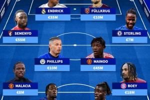 中場(chǎng):塞梅尼奧(伯恩茅斯,5500萬)、卡爾文·菲利普斯(曼城,1000萬)、梅努(曼聯(lián),4500萬)、斯特林(切爾西,700萬)