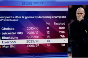 利物浦本賽季英超前12輪比賽僅積18分,成為英超歷史同期積分第四少的衛(wèi)冕冠軍。