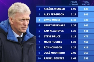 體育資訊11月26日訊 德國轉(zhuǎn)會市場統(tǒng)計了英超主帥執(zhí)教場次排名,莫耶斯728場排名第三,有望追趕弗格森和溫格。