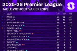 體育資訊11月26日訊 數據網站Squawka票選了本賽季英超每周最具爭議的VAR判罰,并列出了若無VAR誤判的英超積分榜。