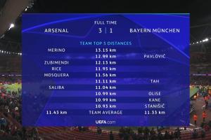兩隊(duì)平均 阿森納11.43km 拜仁11.33km