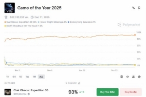 體育資訊11月27日訊 知名博彩網(wǎng)站Polymarket公布了各游戲獲得TGA年度最佳的可能性。其中《光與影:33號遠征隊》以93%幾率斷崖式領(lǐng)先所有其他游戲。