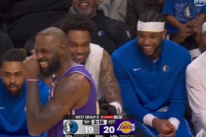 GIF-詹姆斯在場上和替補席的歐文聊天 直接笑尿了