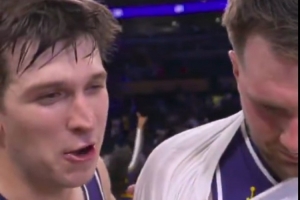 賽后東契奇接受采訪時(shí)里夫斯搶鏡:“我現(xiàn)在扣籃次數(shù)比他多?!?/p>