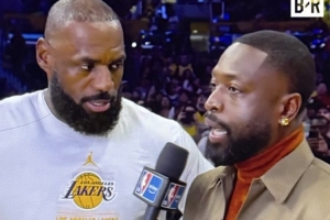 體育資訊12月2日訊 在上周六湖人對陣獨行俠的比賽中,韋德現(xiàn)身場邊采訪詹姆斯。
