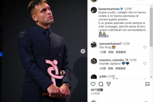 勞塔羅社媒曬出領(lǐng)獎的照片,并寫道:“感謝所有投票支持我的球員,是你們讓我獲得了這個獎項?!?/p>
