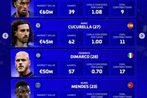 努諾·門德斯(巴黎,23歲,葡萄牙):身價7500萬歐,61場,場均丟0.79球,直接參與20球