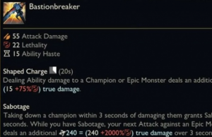 你過(guò)去三秒內(nèi)傷害過(guò)的敵方英雄死亡會(huì)為你提供一個(gè)破壞效果,你對(duì)史詩(shī)級(jí)野怪或者防御塔的下一次攻擊會(huì)消耗掉這個(gè)效果,造成基于穿甲的額外持續(xù)傷害