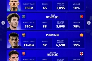 內(nèi)維斯(巴黎,21歲,葡萄牙):身價9000萬歐,55場,3893分鐘,勝率78%