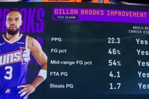 場(chǎng)均22.3分1.7斷4.1次罰球出手,投籃命中率46%,中距離命中率54%
