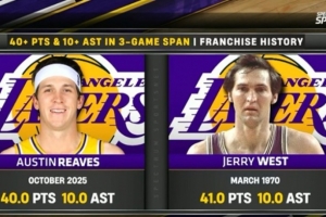 在最近的三場比賽中,里夫斯場均得到40分10助攻,隊史第二人,比肩杰里-韋斯特。