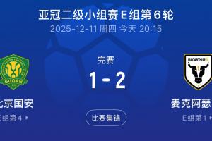 體育資訊12月11日訊 亞冠二級小組賽E組第6輪,北京國安1-2輸給麥克阿瑟FC。本輪中超球隊(duì)亞冠賽場表現(xiàn),海港、蓉城戰(zhàn)平,國安、申花失利。