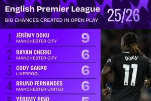 本賽季英超運(yùn)動(dòng)戰(zhàn)創(chuàng)造重大機(jī)會(huì)排名: