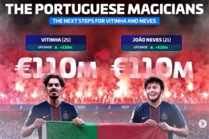 葡萄牙中場(chǎng)雙核!25歲維蒂尼亞、21歲若昂·內(nèi)維斯均達(dá)1.1億歐