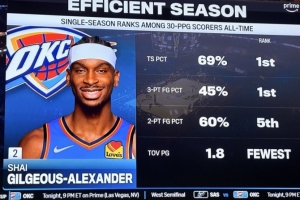 在單賽季所有場(chǎng)均至少30分的球員中,亞歷山大真實(shí)命中率69%、三分命中率45%皆是歷史第一;兩分球命中率60%是歷史第5,場(chǎng)均1.8失誤是歷史最少。