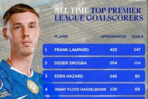 體育資訊12月14日訊 在本輪英超切爾西2-0擊敗埃弗頓的比賽中,帕爾默破門(mén)。切爾西官方也曬出了隊(duì)史英超射手榜,帕爾默升至第9,具體榜單如下: