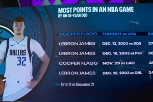 據(jù)統(tǒng)計,18歲球員單場得分榜前五如圖,詹姆斯和弗拉格霸榜。