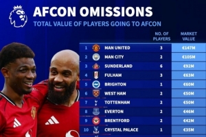 體育資訊12月17日訊 非洲杯即將戰(zhàn)火重燃,《轉(zhuǎn)會(huì)市場(chǎng)》也統(tǒng)計(jì)了因?yàn)橐獏⒓臃侵薇x隊(duì)的英超各隊(duì)身價(jià)損失榜,曼聯(lián)居首。