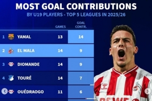體育資訊12月18日訊 《轉(zhuǎn)會(huì)市場(chǎng)》統(tǒng)計(jì)了本賽季五大聯(lián)賽U19球員直接參與進(jìn)球榜,亞馬爾無(wú)懸念領(lǐng)跑。