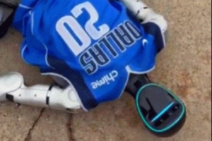 視頻中一個(gè)穿著獨(dú)行俠球衣的機(jī)器人正在施展回旋踢等招數(shù),歐文溜過來使勁推了一把,機(jī)器人應(yīng)聲倒地沒了動(dòng)靜。