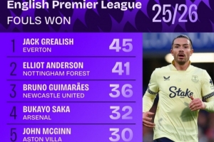 體育資訊12月19日訊 數(shù)據(jù)機構(gòu)squawka統(tǒng)計了本賽季英超造犯規(guī)次數(shù)榜,被曼城外租的格拉利什居首。