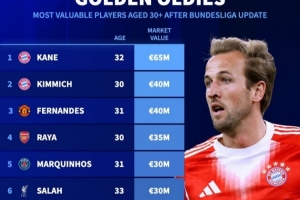 1.哈里·凱恩(拜仁),32歲,6500萬