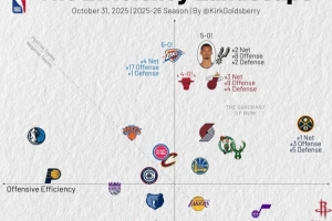 橫軸代表進攻效率,越靠右越好,縱軸代表防守效率,越靠上越強。第一象限的球隊多為發(fā)揮出色的球隊,而在第三象限的球隊通常為戰(zhàn)績比較糟糕的球隊。