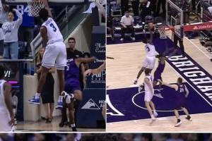 NCAA常規(guī)賽,楊百翰大學對陣艾柏林基督大學,迪班薩上演炸裂單手隔人補扣。