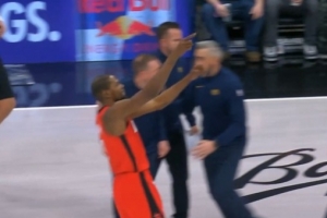場(chǎng)邊看數(shù)據(jù)很滿意!樂(lè)福首節(jié)4中3&2記三分拿下8分4板1斷